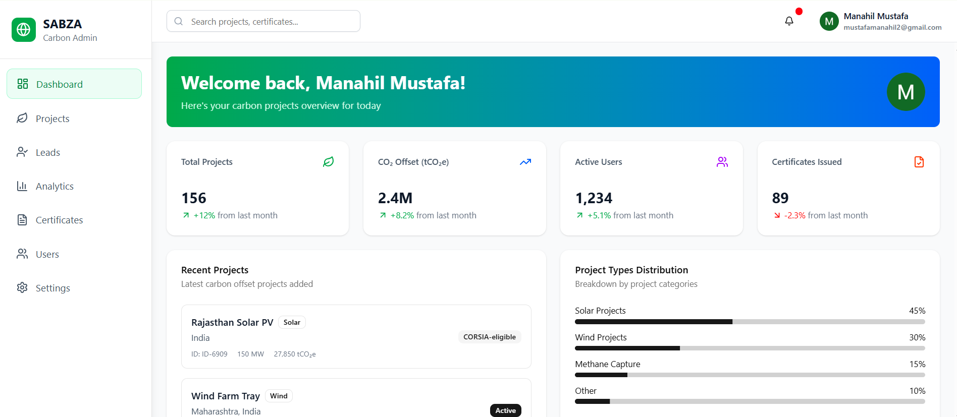 Admin panel for SABZA Carbon, a carbon offset platform, allowing management of projects and user interactions.